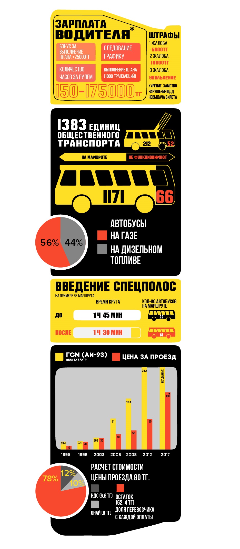 В Алматы насчитывается 20 частных автопарков со 1400 автобусами, а ежедневно на линию выходят 1105 единиц общественного транспорта. Предлагаем читателям взглянуть на городской автобус через призму интересных цифр и доступной статистики.