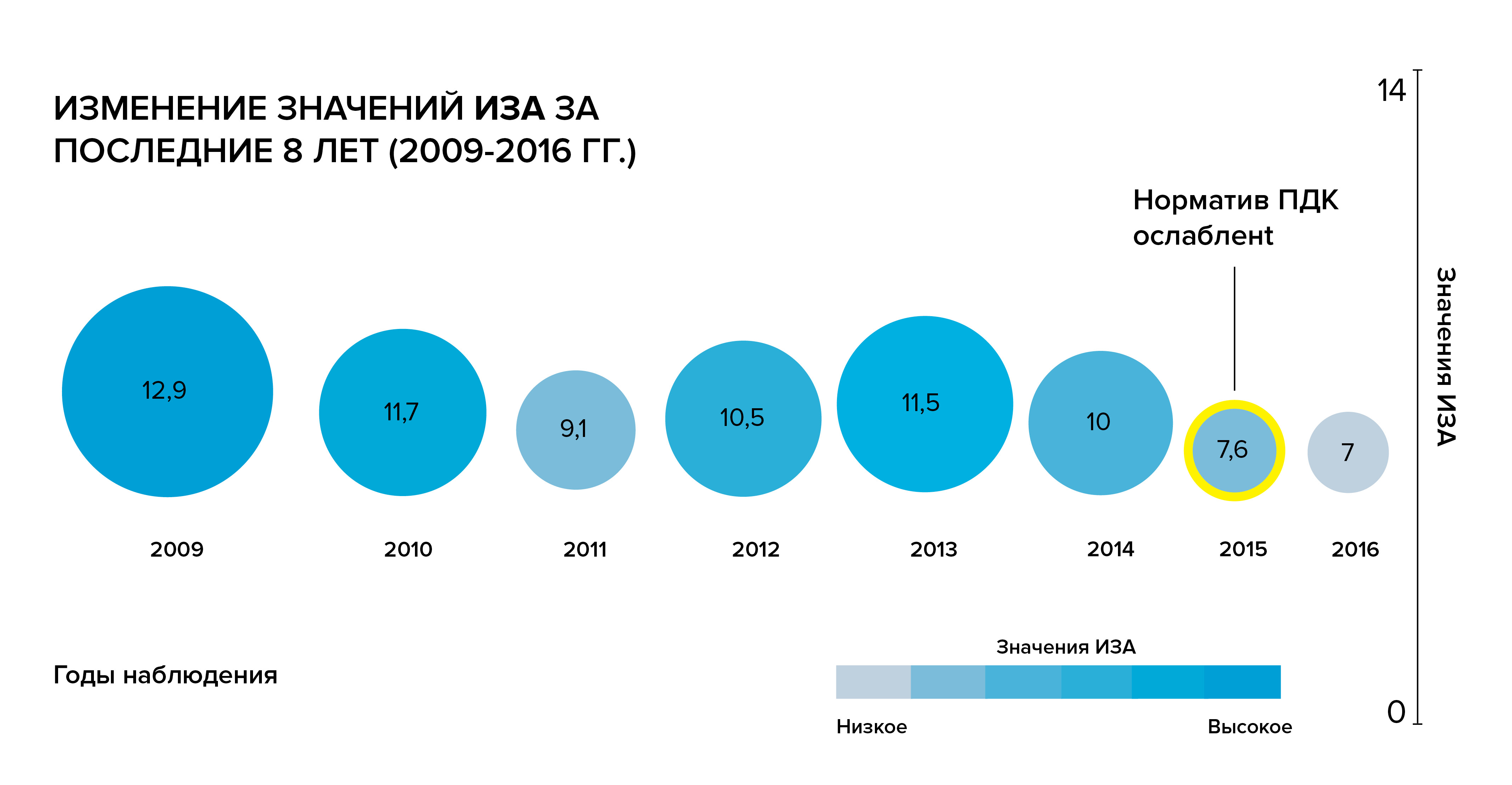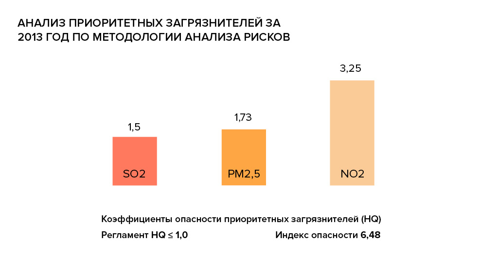«Следующим приоритетным загрязнителем воздуха является диоксид серы, который также поражает органы дыхания. Хотя кратность превышения ПДК по нему не столь значительна, как по предыдущим загрязнителям, превышение допустимых норм пришлось на 2012, 2013 и 2016 годы», – рассказал он.