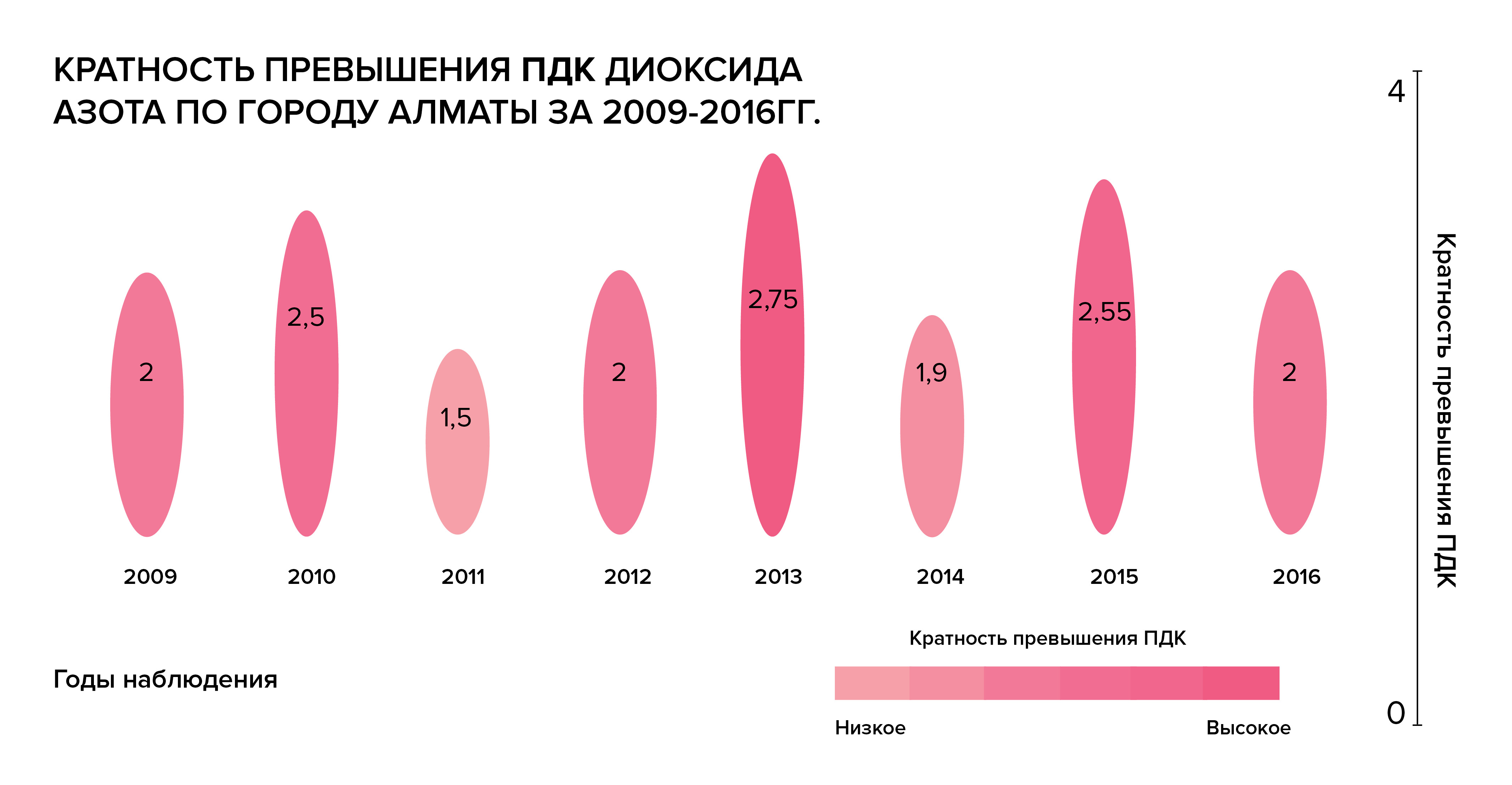 По всем приоритетным загрязнителям воздуха в те или иные годы в Алматы зафиксированы превышения допустимых концентраций (ПДК). За 8 лет наблюдения уровень загрязнения воздуха в Алматы диоксидом азота был очень высоким – от 1,5 ПДК до 2,75 ПДК. Известно, что диоксид азота поражает органы дыхания и кровь. По словам Армана, уровень загрязнения повышался постепенно и в 2013 году достиг пикового значения – 2,75 ПДК. В 2014 году он снизился до 1,9 ПДК и уже следующий пик отмечен в 2015 году (2,5 ПДК). В прошлом году загрязнение снизилось до 2 ПДК.
