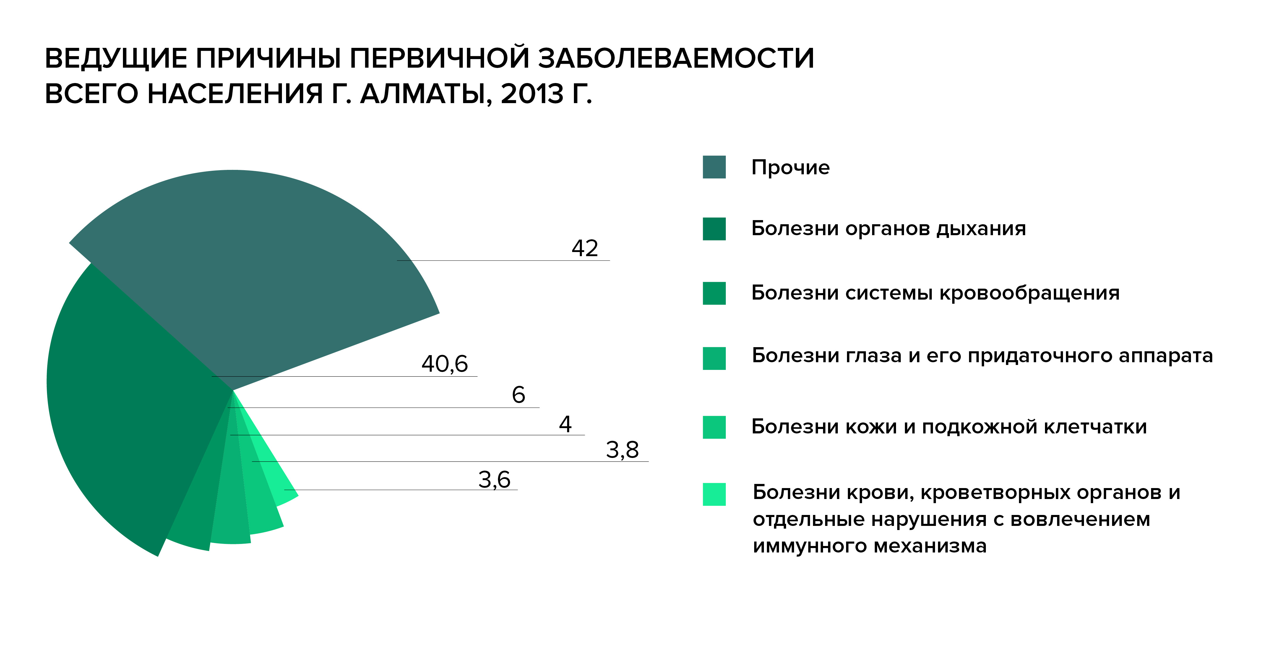 Ведущее место среди причин взрослой заболеваемости в 2013 г. были также болезни органов дыхания, которые составили 23,8 %. На втором месте находились болезни системы кровообращения – 11,3 %. Третье место занимали болезни глаза и его придаточного аппарата – 4,3 %. Далее – болезни кожи и подкожной клетчатки (3,8 %), болезни крови, кроветворных органов и отдельные нарушения с вовлечением иммунного механизма (3,2 %), на долю которых приходилось 46,4 % всех заболеваний взрослого населения г. Алматы. Среди болезней органов дыхания пневмония составила 1,7% (1,9‰); бронхит хронический и неуточненный, эмфизема – 4,4% (4,9‰); бронхиальная астма – 0,6% (0,7‰).