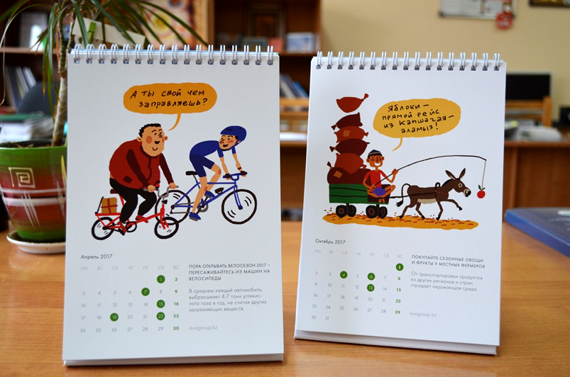 Каждая из 12 авторских иллюстраций из жизни алматинцев сопровождается коротким экологическим советом.